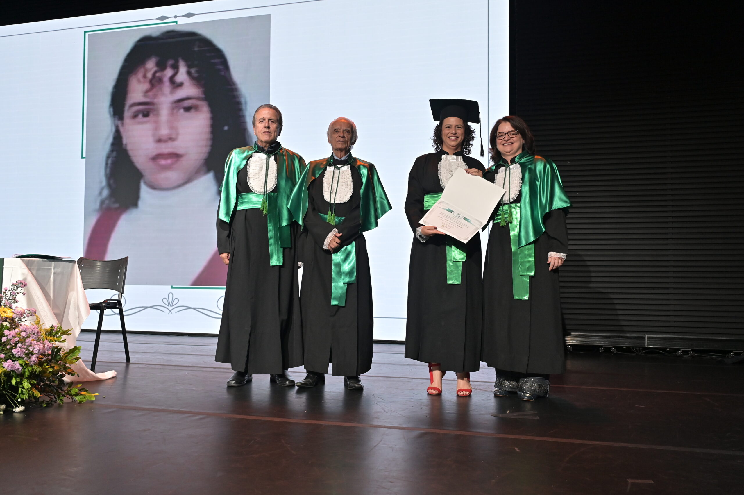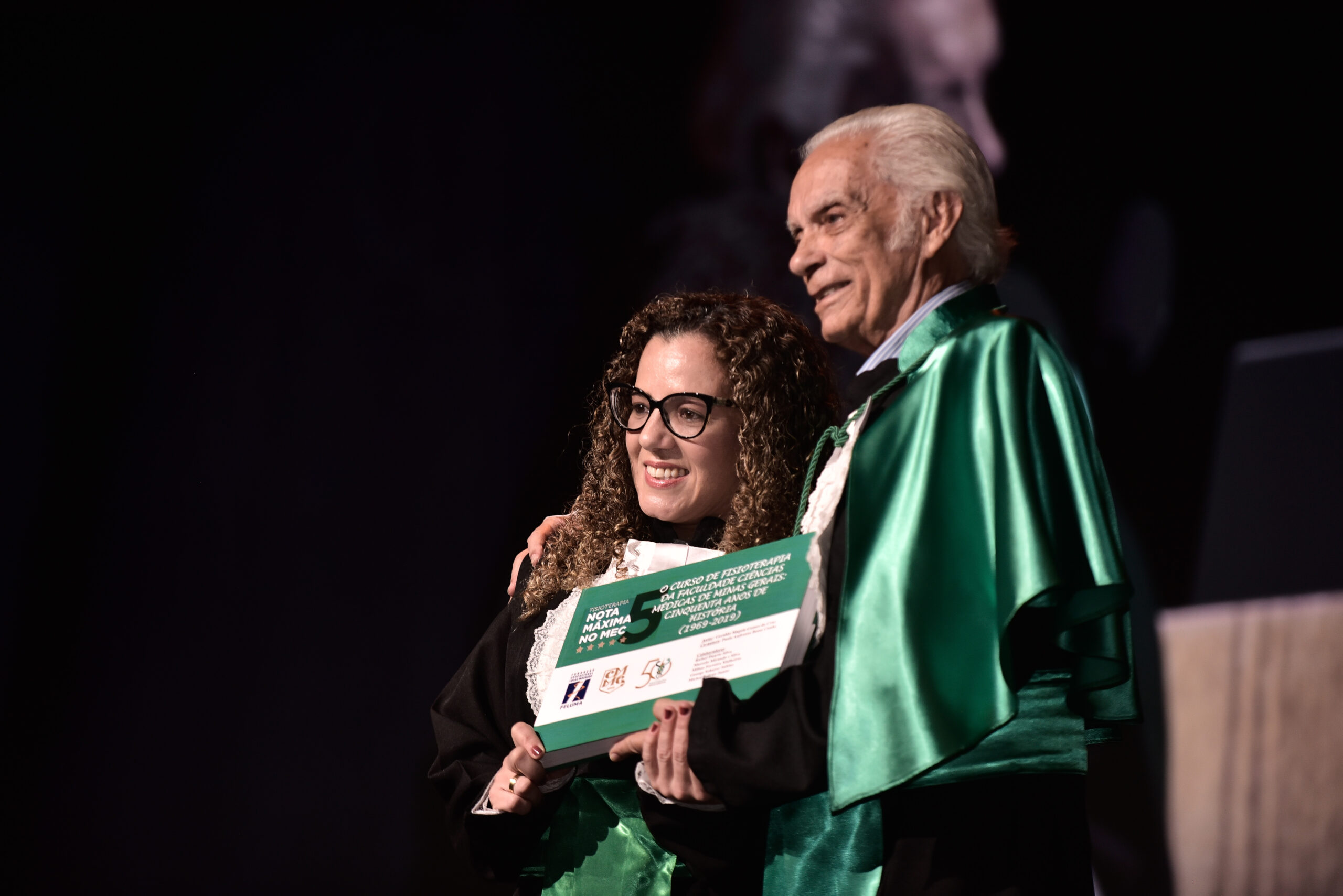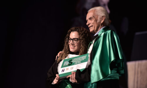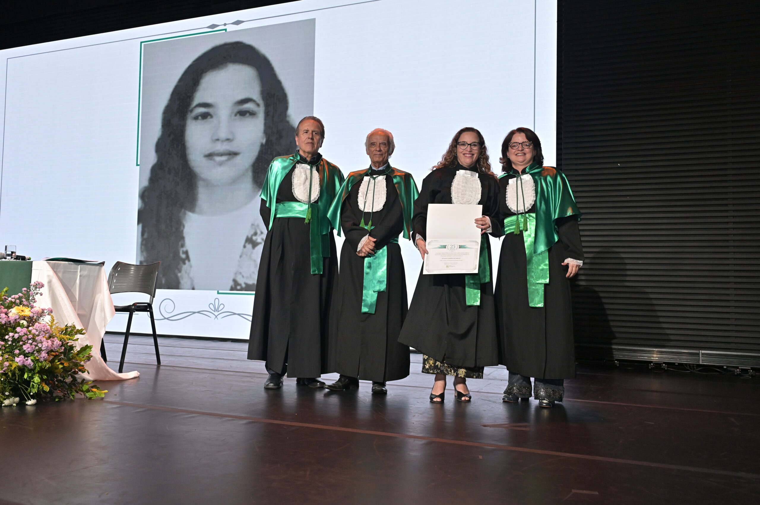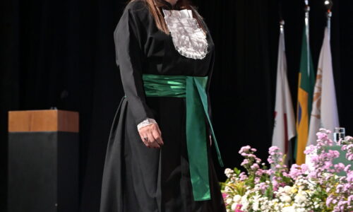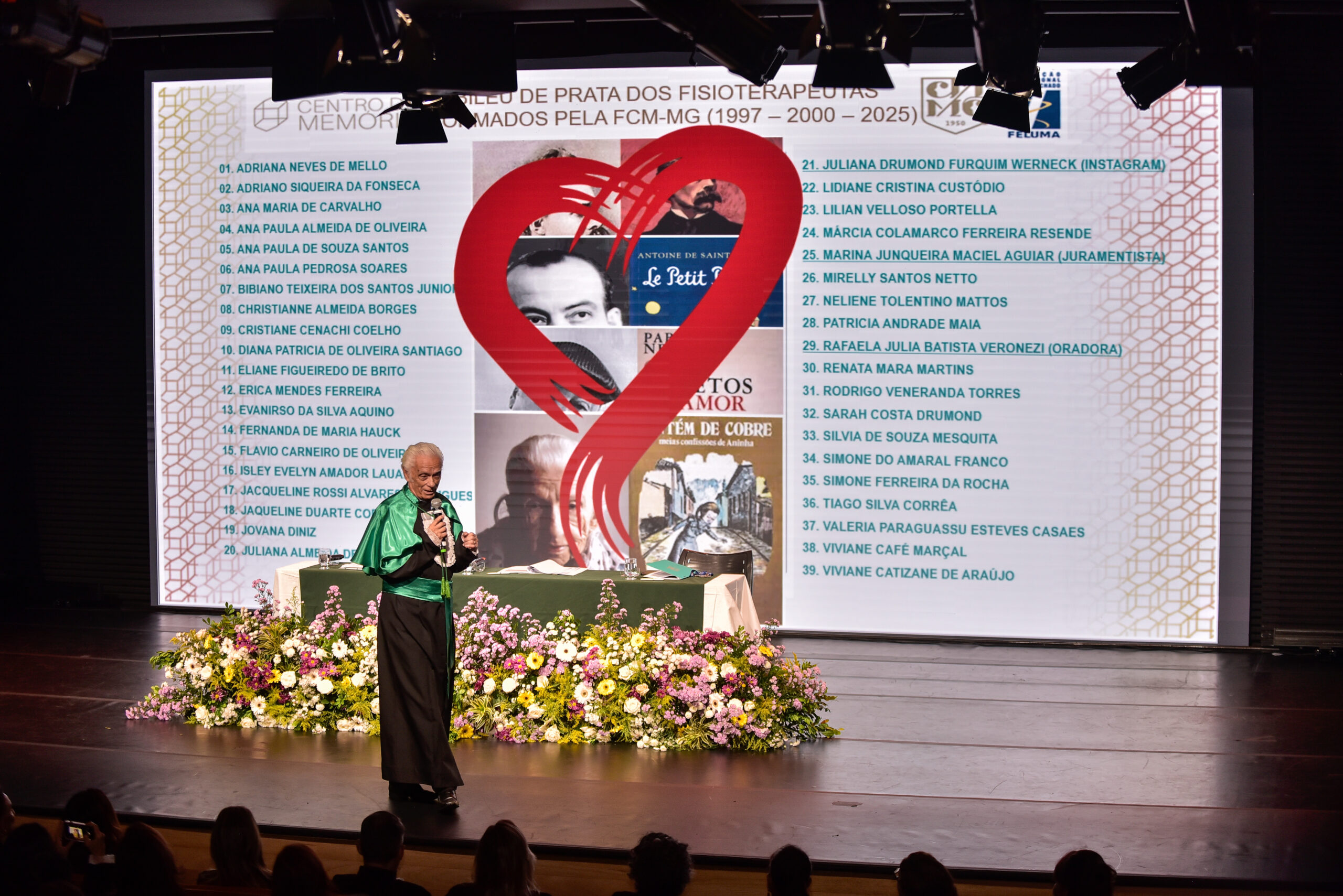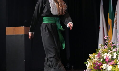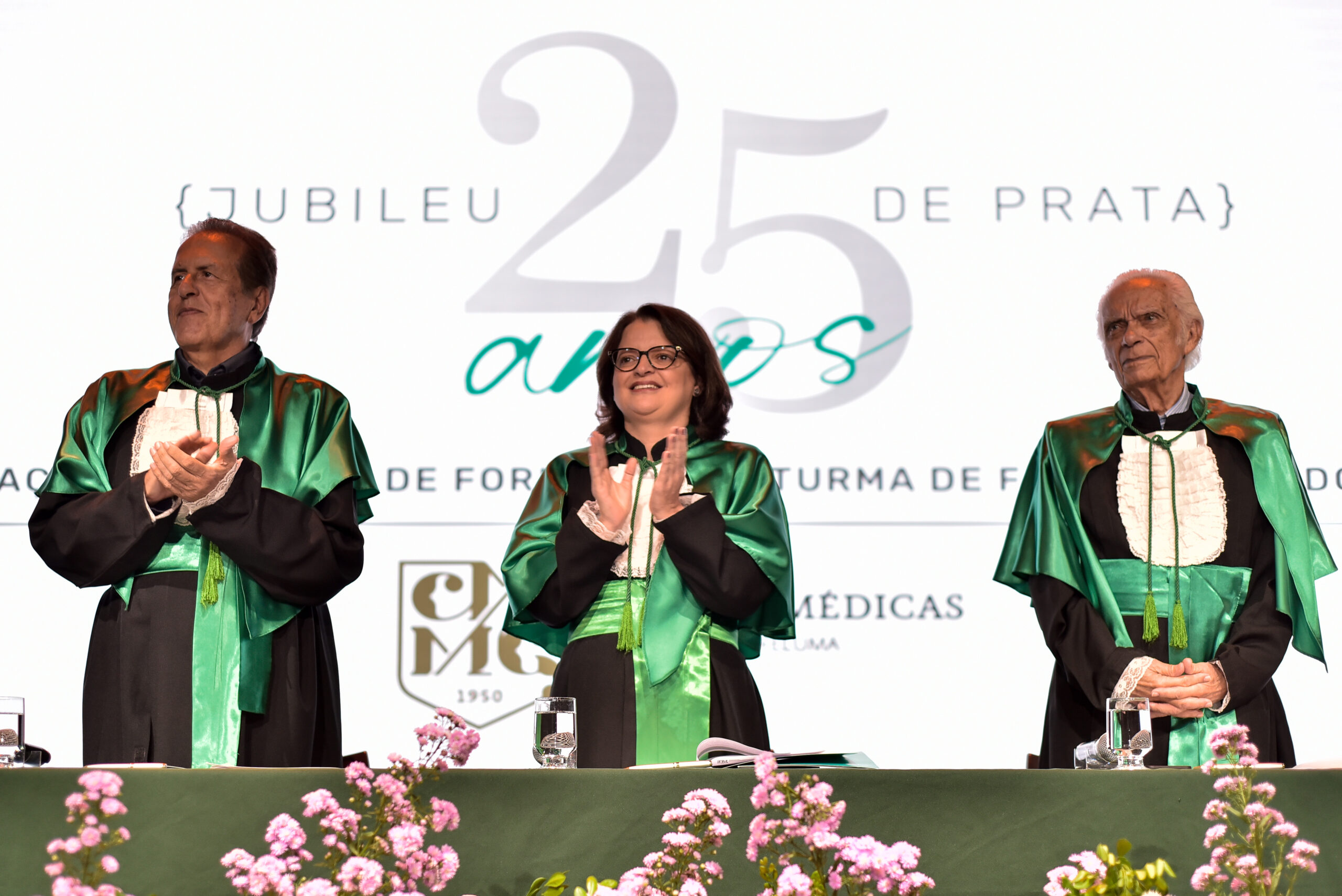 Um agradecimento especial foi dedicado à egressa Juliana Drumond Furquim Werneck, idealizadora e principal organizadora da cerimônia comemorativa. Muito querida por seus colegas, Juliana é reconhecida por manter o grupo unido e promover momentos de celebração ao longo dos anos. Em sua palestra, o Prof. Geraldo Magela reservou um momento especial para homenageá-la, presenteando-a com sua apresentação e destacando a relevância histórica de sua família para a Feluma e para a medicina mineira. Seu avô, Dr. Jaime Werneck, foi professor da FCM-MG e médico ginecologista, e seu bisavô, Dr. Hugo Werneck, foi um dos fundadores da UFMG, um dos primeiros médicos de Belo Horizonte e mentor do Dr. Lucas Machado.