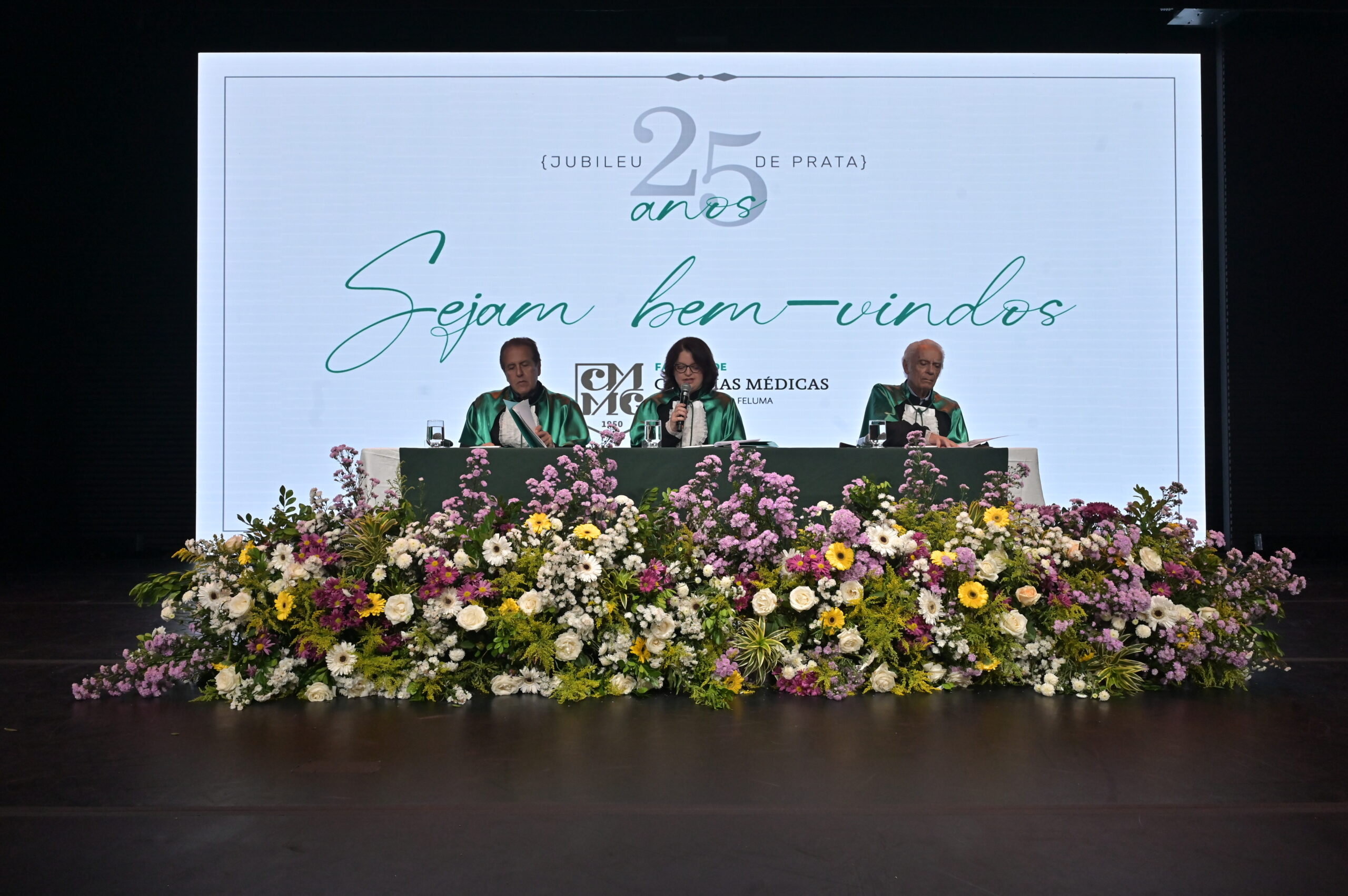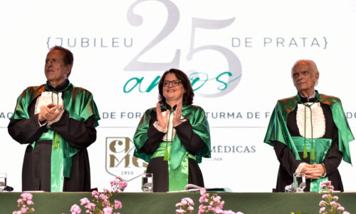 A mesa solene foi composta pela professora homenageada da turma, Prof.ª Ana Paula Lima de Almeida Amorim, vice-reitora da Feluma/FCM-MG e, na ocasião, também representante do reitor da Feluma/FCM-MG, Prof. José Celso Cunha Guerra Pinto Coelho; pelo Dr. Eduardo Luis Guimarães Machado, representando o presidente da Feluma, Dr. Wagner Eduardo Ferreira; e pelo Prof. Geraldo Magela Gomes da Cruz, curador do Centro de Memória da FCM-MG.