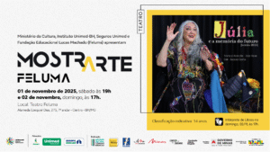 O Ministério da Cultura, o Instituto Unimed-BH, a Seguros Unimed e a Fundação Educacional Lucas Machado (Feluma) apresentam a programação da MostrArte Feluma para o mês de novembro. Mais uma opção casada que promete encantar o público do Teatro Feluma. Desta vez, o teatro e o bordado entram em cena, tendo como protagonista da peça e instrutora dos desenhos a atriz Juçara Costa. No dia 01 de novembro, sábado, de 14h às 18h, acontece a Oficina Método DB de desenhos bordados, logo depois, às 19h, a atriz volta ao palco para interpretar “Júlia e a memória do futuro”. No domingo, dia 02 de novembro, às 17h, tem uma nova sessão da peça “Júlia e a memória do futuro”. E o melhor é que toda a programação Mostrarte Feluma é gratuita. É só entrar na plataforma Sympla e retirar o ingresso.